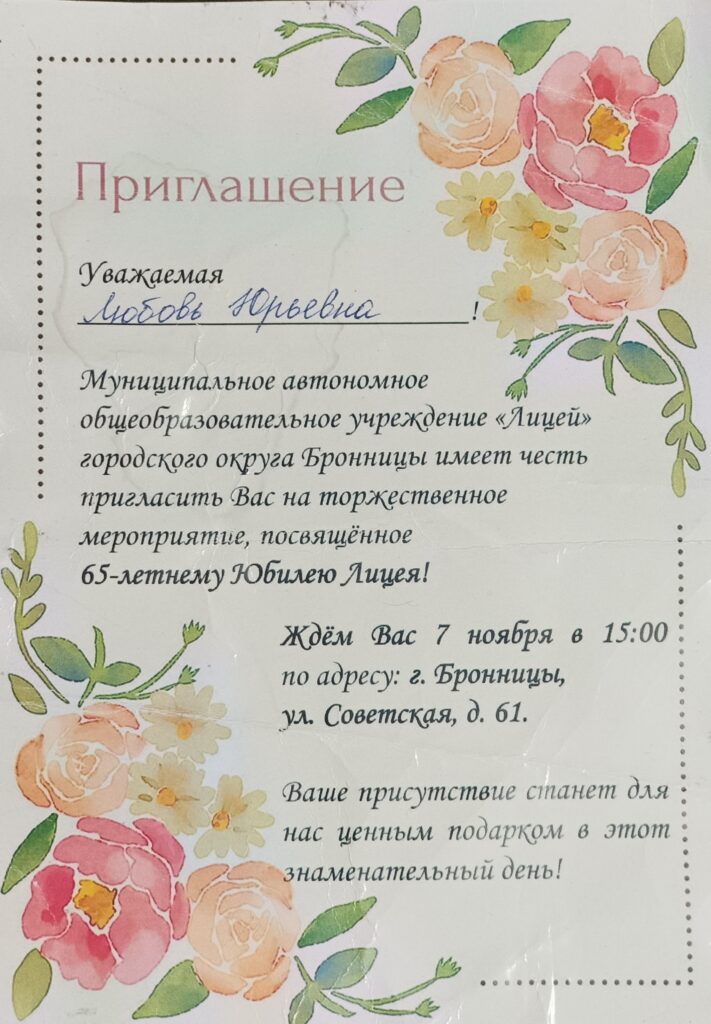 7 ноября 2025 года в зале КДЦ «Бронницы» состоялось торжественное мероприятие, посвященное 65-летнему Юбилею Лицея, на которое были приглашены члены Бронницкой городской организации инвалидов ВОИ.